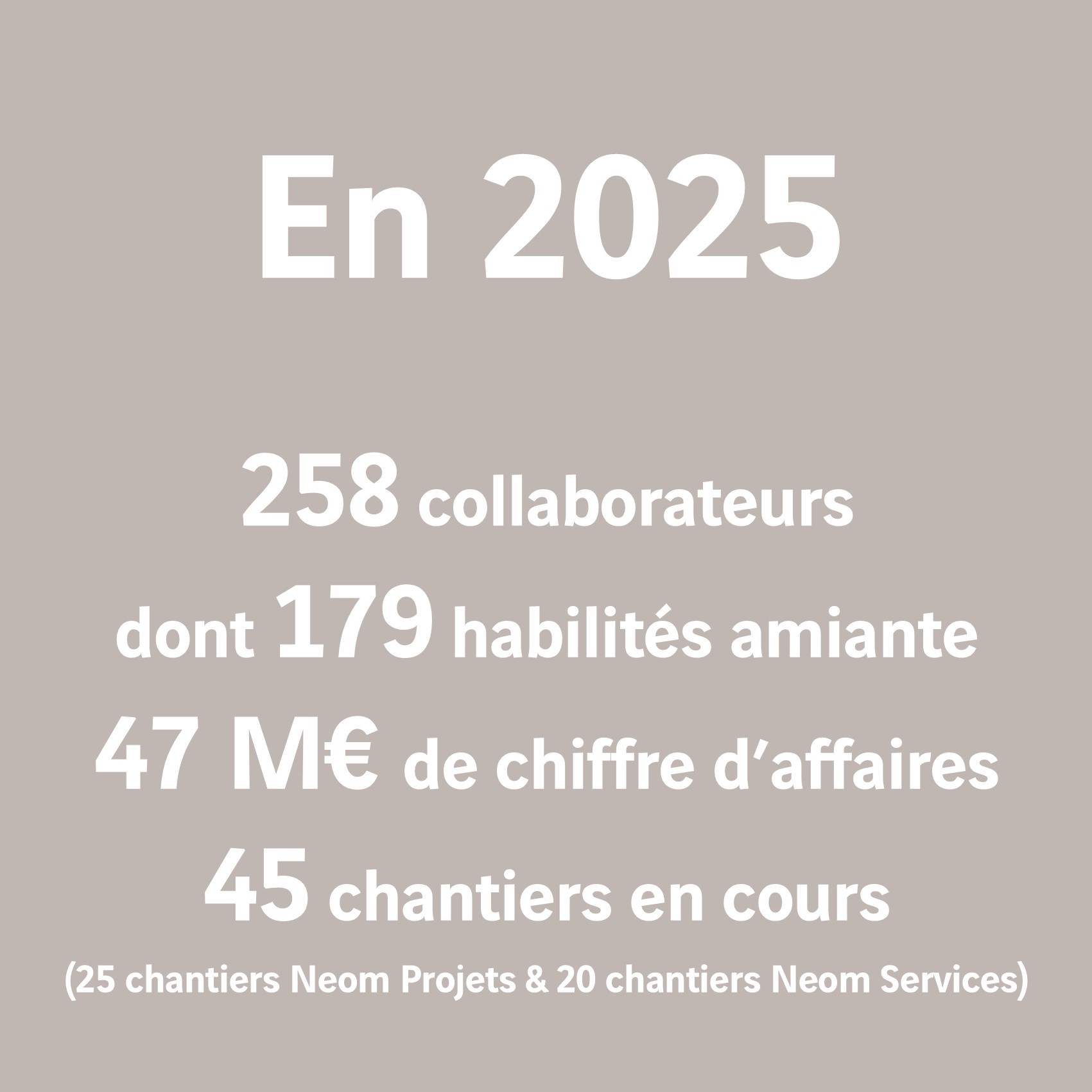 Neom fait partie intégrante de la Délégation des Ouvrages fonctionnels réhabilités et métiers de spécialités et gère les projets de désamiantage, déplombage, curage et de logistique sur la France entière.